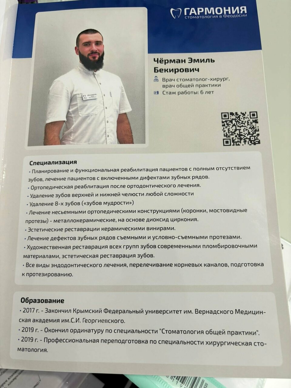 Оставался предпоследний день отдыха в Феодосии и вот случилась неприятность, сломался зуб. Обзвонила десяток клиник, чтоб приняли сегодня срочно, и только в стоматологии ‘Гармония’ благодаря отзывчивого администратора нашли окошко и приняли меня. Попала в руки замечательного доктора, с ‘золотыми руками’, восстановил зуб. Хочу поблагодарить Чёрмана Эмиля Бекировича за профессионализм, неравнодушное отношение к пациентам. Осталась очень довольна результатом, побольше таких врачей