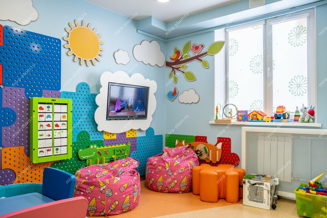 - Мотивация для детей (сюрпризы, игровая зона, жетоны за лечение).