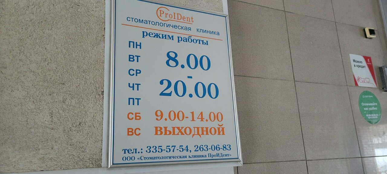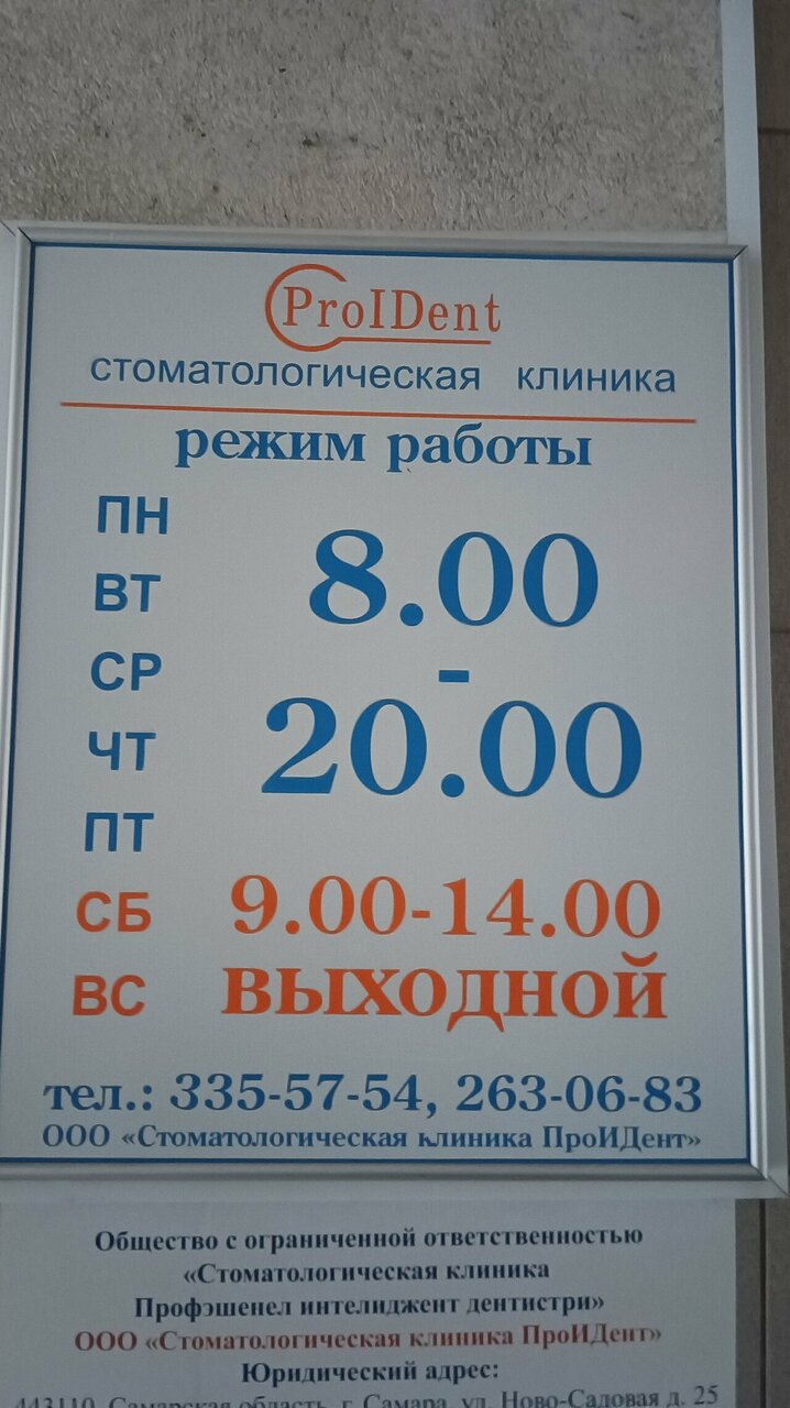 PROident работает с понедельника по пятницу с 09:00 до 20:00, а в выходные дни (суббота и воскресенье) — с 09:00 до 15:00. Связаться с клиникой можно по телефонам: +7 (958) 731-18-26 и +7 (846) 335-57-54.