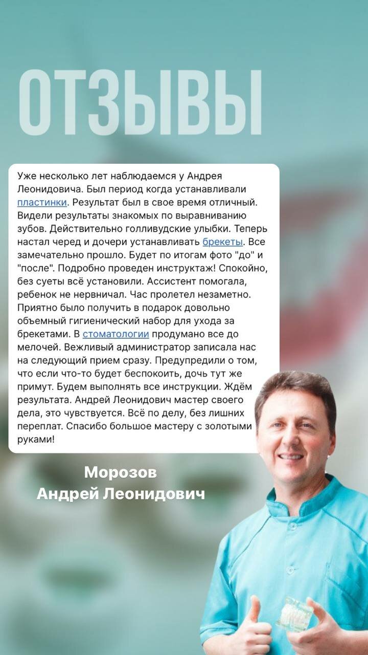 Много лет обслуживаемся здесь, Андрей Леонидович Морозов- замечательный ортодонт, с большим опытом работы. Выровнял зубы моей дочери. И теперь она не стесняется улыбаться.И другие врачи тоже мастера своего дела. Все сотрудники на своем месте- от медсестры до администратора- работают слаженно, как часовой механизм.В клинике всегда чисто, многолюдно- это говорит о популярности клиники и профессионализме врачей. Всегда много деток. Спасибо за прекрасное обслуживание!!!