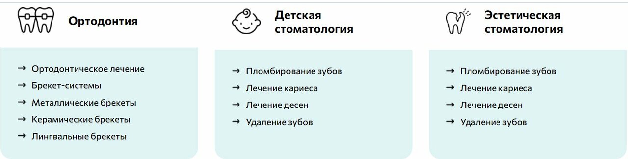 - Гибкий подход к клиентам (коррекция брекетов, лечение без страха).